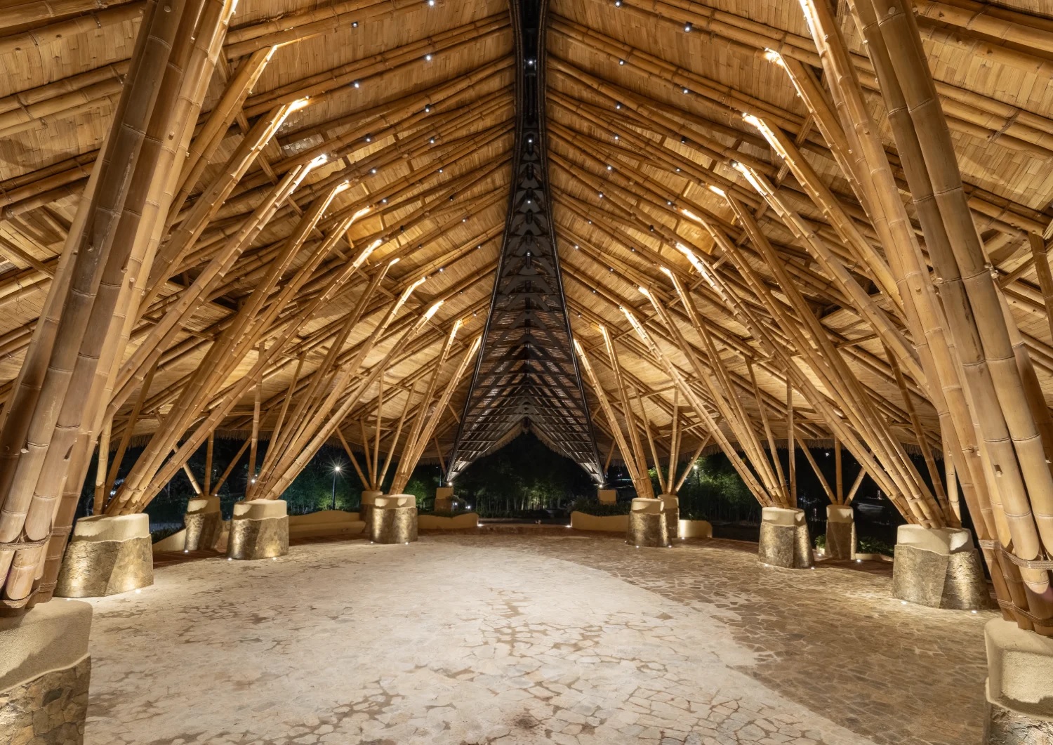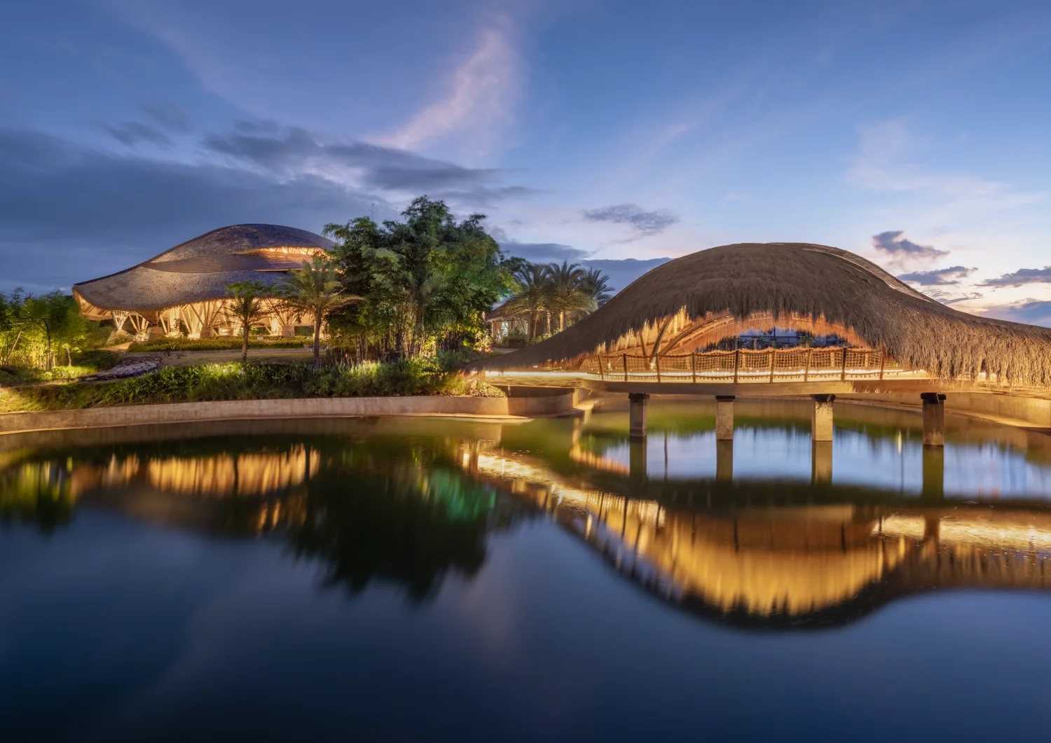 The lighting design at Kaway’an complements the natural materials and architectural rhythms of the park. In the grand pavilion, warm uplighting accentuates the bamboo columns, while soft roof lighting reveals texture and depth. Bridges and walkways are lit with subtlety, creating a sense of flow and rhythm that guides visitors through the space. All this reflects as a gentle radiance on the lagoon waters, creating a memorable experience that resonates long after the sunset.